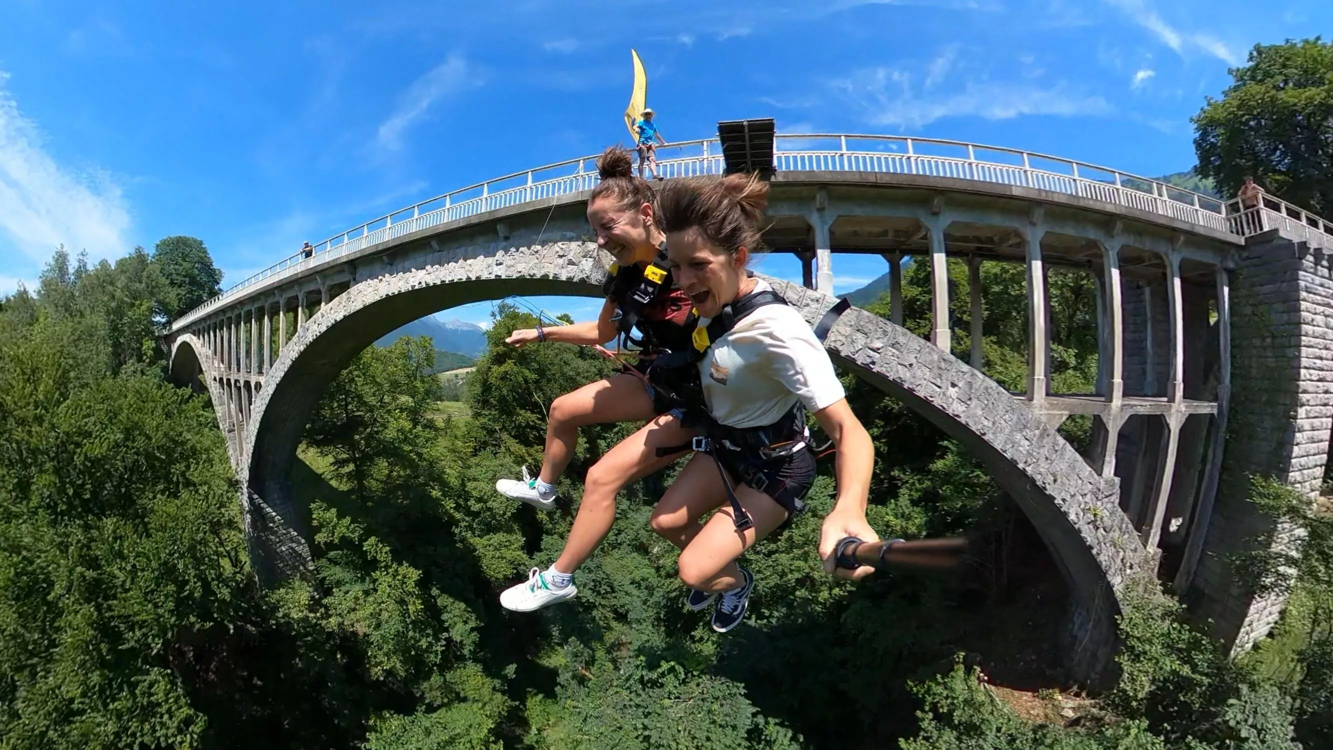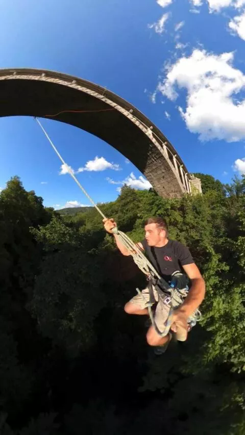 c'est en tandem, relié l'un à l'autre, que vous partirez en orbite sous l'arche du grand pont de Seythenex, attaché solidement aux cordes.